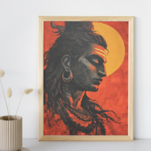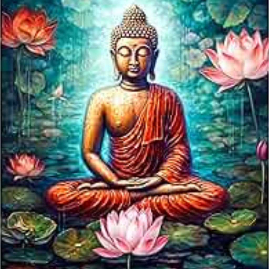 Subtle, soothing colors such as warm golds, earthy browns, and calming blues enhance the tranquil aura of the artwork. The background—often inspired by nature elements like lotus flowers, flowing water, or a soft halo of light—adds depth and reinforces the spiritual essence of the painting. Fine details and smooth brushwork bring a sense of purity and balance, making the scene feel timeless and sacred.