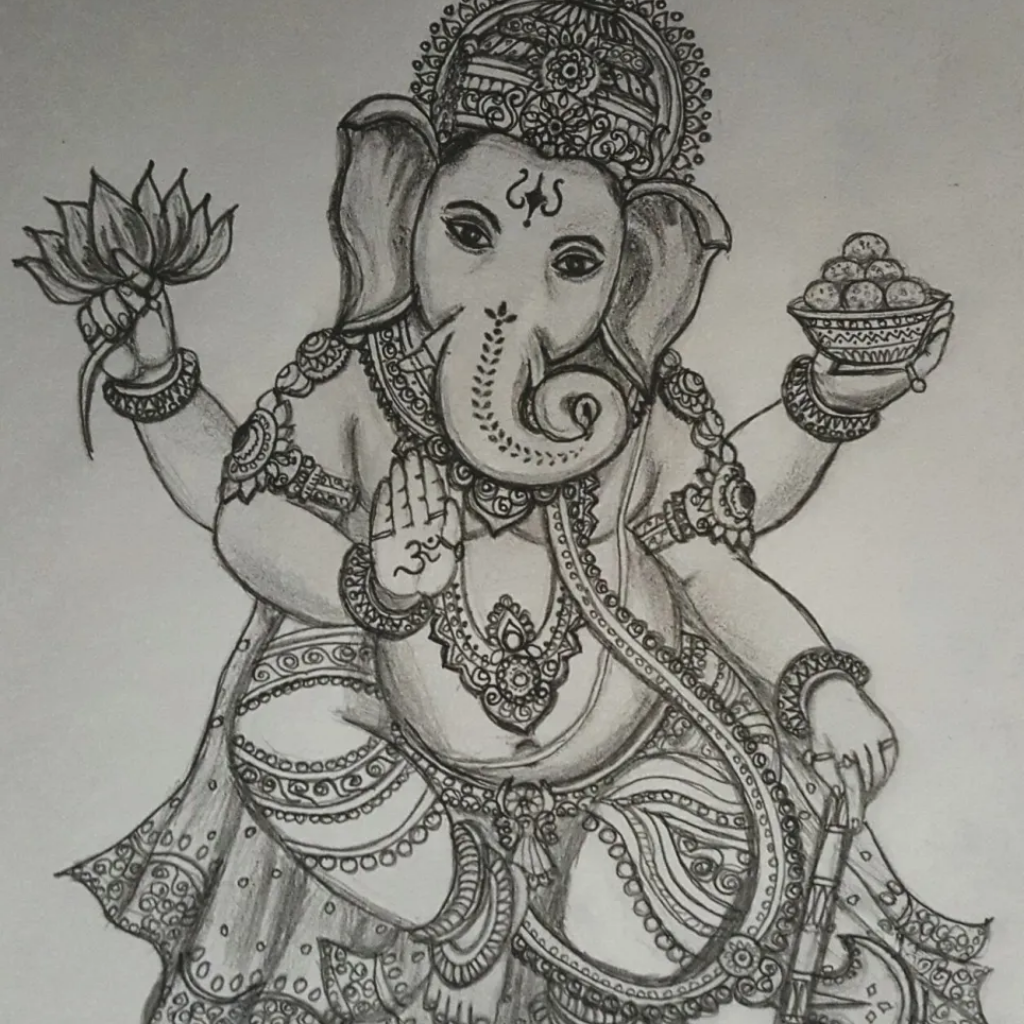 Rich, warm colors such as saffron, gold, red, and soft pastels bring the painting to life, creating an inviting and uplifting atmosphere. Traditional details like the modak in his hand, the sacred tilak, and his blessing gesture (abhaya mudra) add spiritual depth, while a lotus or glowing aura in the background enhances the sense of divinity. The smooth blending of colors and intricate patterns highlight both devotion and artistic finesse.