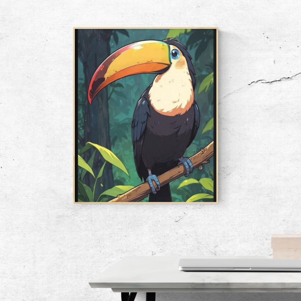 A vibrant wall painting of a duck-billed macaw captures exotic beauty, curiosity, and playful charm in a striking composition. The bird’s distinctive broad, duck-like beak combined with the elegant form of a macaw creates a unique and eye-catching subject. Its expressive eyes and confident posture bring personality to the artwork, making the bird feel lively and engaging. The painting instantly adds character and a sense of wonder to the space.