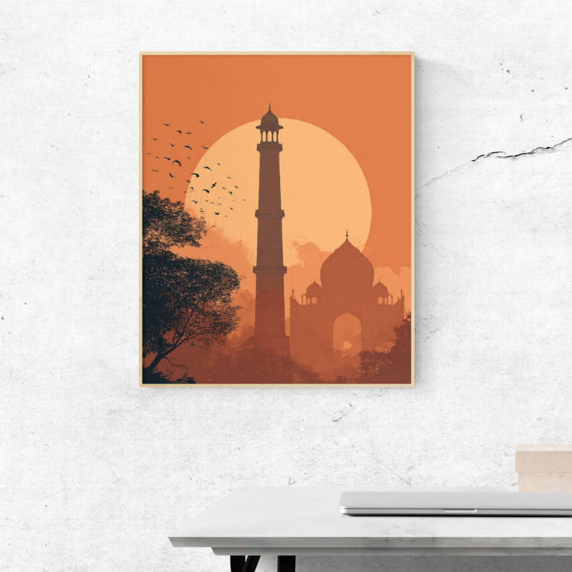 A timeless wall painting of the Taj Mahal captures the eternal beauty of love, symmetry, and architectural brilliance. Standing gracefully along the banks of the Yamuna River, the ivory-white monument glows softly under changing light, reflecting serenity and romance. The painting highlights the iconic central dome, elegant minarets, and intricate marble details that make the Taj Mahal a symbol of perfection and devotion.